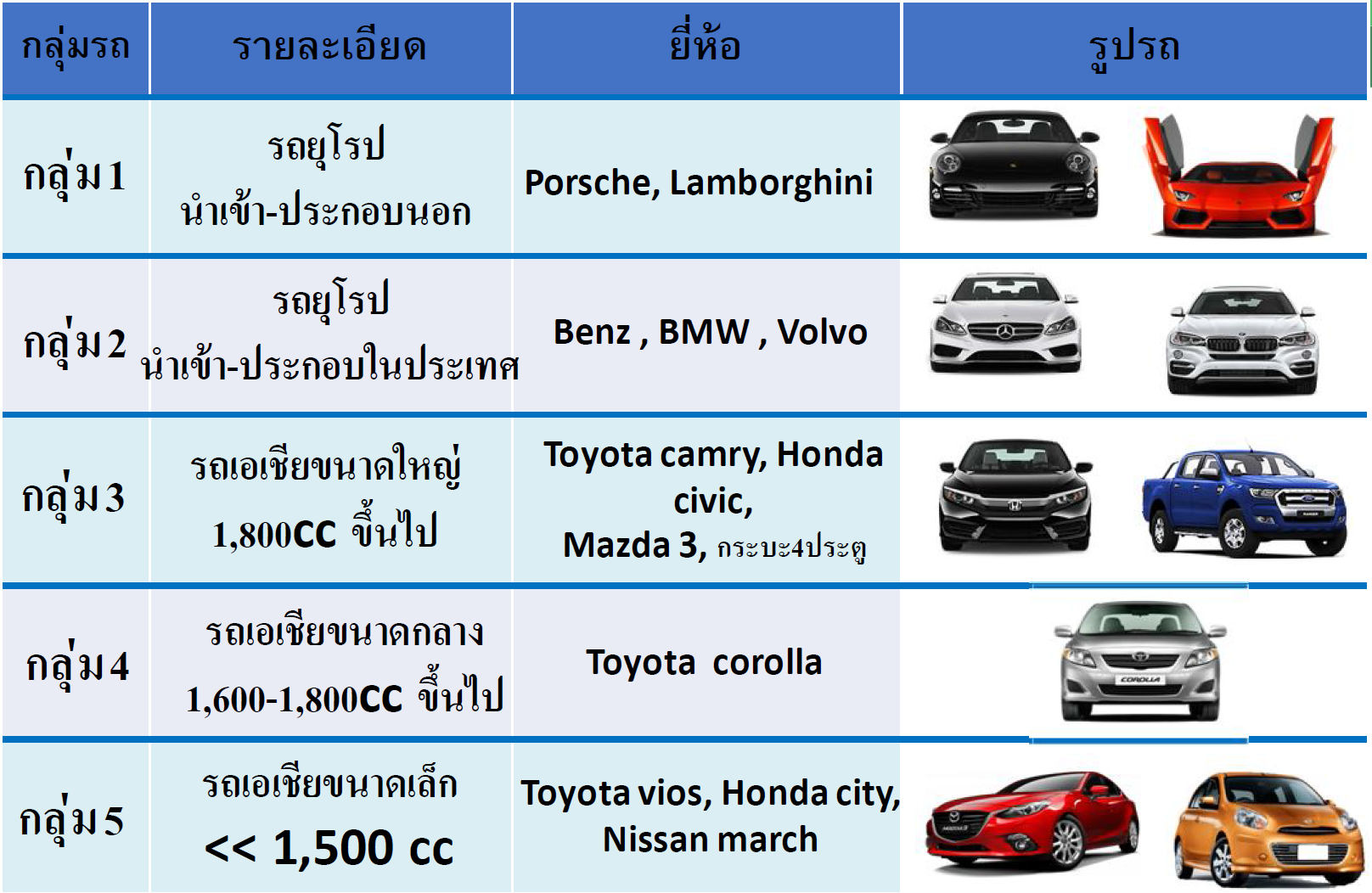 กลุ่มรถยนต์มีผลต่อราคาเบี้ยประกันรถยนต์อย่างมาก อะไหล่ของกลุ่มรถที่ผลิตในประเทศนั้นสามารถหาได้ง่ายกว่ากลุ่มรถนำเข้าเพราะมีโรงงานผลิต อยู่ในประเทศอยู่แล้ว ส่วนกลุ่มรถนำเข้านั้นมักมีเบี้ยประกันรถสูงกว่า เพราะต้องใช้อะไหล่นำเข้าจากต่างประเทศซึ่งต้องเสียทั้งค่าขนส่ง และราคาอะไหล่ที่มีราคาสูงกว่า