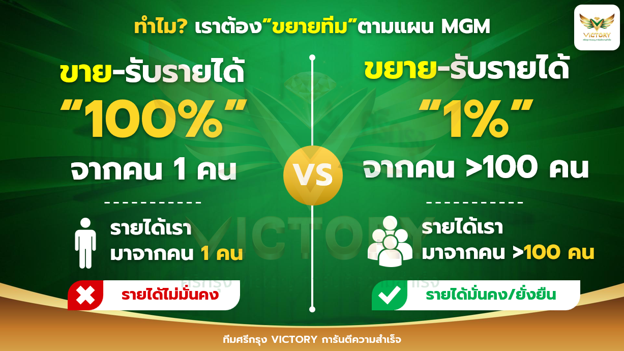 - 1% จาก 100 คน : กระจายความเสี่ยงได้ดีกว่ามาก และด้วยแผนการตลาดแบบ MGM (Member Get Member) แนะนำบอกต่อ คุณสามารถพัฒนาต่อยอดสร้างทีมงานนายหน้าประกัน ซึ่งจะสร้างรายได้ไร้ขีดจำกัดให้กับทั้งตัวสมาชิกและผู้แนะนำ