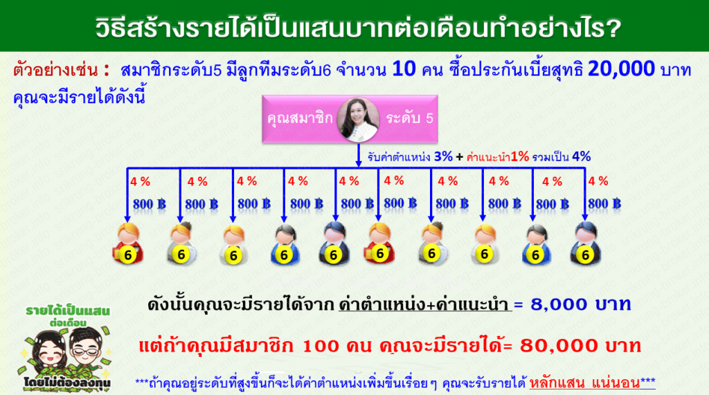Ex. สำหรับสมาชิกที่มีบัตรนายหน้า ระดับ 5 ขึ้นไป แนะนำระดับ 6 กลุ่มคนสมัครซื้อใช้เอง เป้าการสมัครรับส่วนลด เบี้ยประกันที่ต้องจ่าย